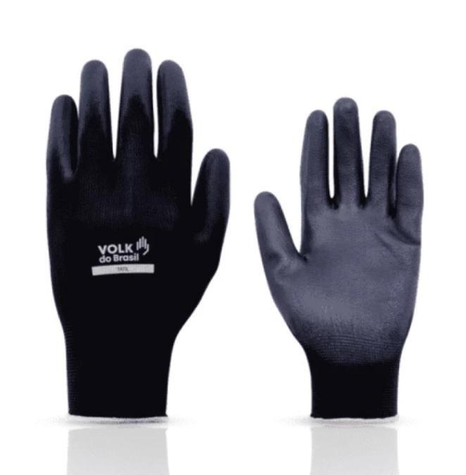 Luva de segurança confeccionada em fibras sintéticas, revestimento da face palmar e ponta dos dedos em poliuretano (PU), punho com inserções de fibras elásticas e acabamento em fibras sintéticas.